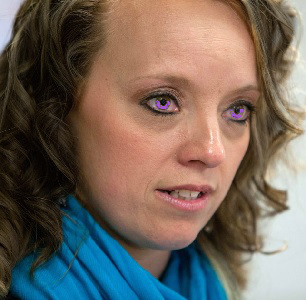 Une femme d'environ quarante ans, haute comme trois pommes, chatain aux cheveux bouclés, à la robe bleue marine, une cicatrice sur la joue gauche, vous regarde de ses yeux violets perçants.