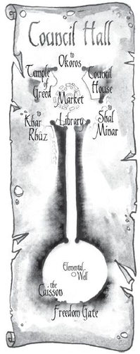 Le PilierUn large pilier gît au centre du hall et supporte une gigantesque statue de Garlen. Le pilier comporte aussi deux grosses portes métalliques couvertes d’ornementations d’orichalques mènent aux niveaux directement sous le Hall du Conseil. Les portes sont lourdement gardées et une rambarde métallique empêche que l’on s’approche trop du pilier.
