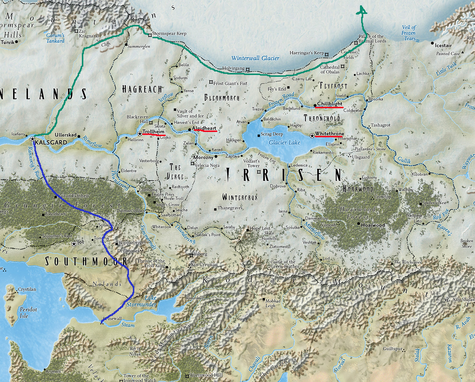 L'itinéraire le plus connu est celui-ci... lance l'ulfen en griffonnant sur la carte. C'est le plus facile mais également le plus connu. Si vos amis vous surveille, ce n'est peut-être pas le meilleur à suivre. Mais pour se rendre à ce point si! 39147-0 Indiquant la ville d'Urjuk, Il nous faudra traverser une partie des terres du Linnorn, l'Irrisen et un partie des terres des seigneurs des mammouths. Si tout và bien, il faudra environ 1 mois pour se rendre jusqu'à Urjuk. Ensuite, nous emprunterons cet itinéraire ou celui-ci 39149-1