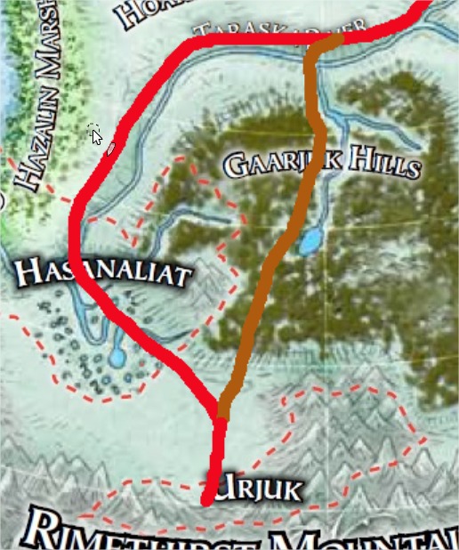 L'itinéraire le plus connu est celui-ci... lance l'ulfen en griffonnant sur la carte. C'est le plus facile mais également le plus connu. Si vos amis vous surveille, ce n'est peut-être pas le meilleur à suivre. Mais pour se rendre à ce point si! 39147-0 Indiquant la ville d'Urjuk, Il nous faudra traverser une partie des terres du Linnorn, l'Irrisen et un partie des terres des seigneurs des mammouths. Si tout và bien, il faudra environ 1 mois pour se rendre jusqu'à Urjuk. Ensuite, nous emprunterons cet itinéraire ou celui-ci 39149-1